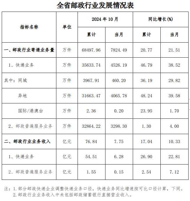 1.部分邮政快递企业调整快递业务口径,快递业务同比增速按可比口径计算。