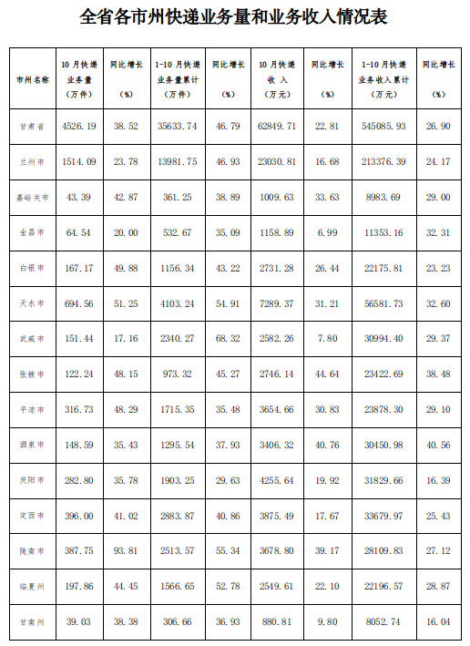 10月,邮政行业业务收入(不包括邮政储蓄银行直接营业收入)完成7.75亿元,同比增长10.33%。其中,快递业务收入完成6.28亿元;同比增长22.81%。
