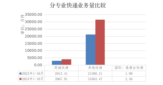 1-10月,同城业务量完成3967.91万件,同比增长36.19%;异地业务量完成31663.47万件,同比增长48.24%;国际及港澳台业务量完成2.36万件,同比增长23.95%。