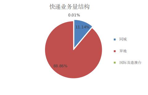 1-10月,同城、异地、国际及港澳台快递业务量分别占全部快递业务量的11.14%、88.86%和0.01%。